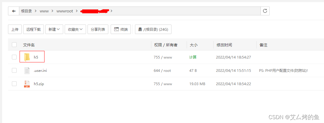 将h5文件夹打包上传服务器解压缩后,指定网站路径。比如上传至宝塔。