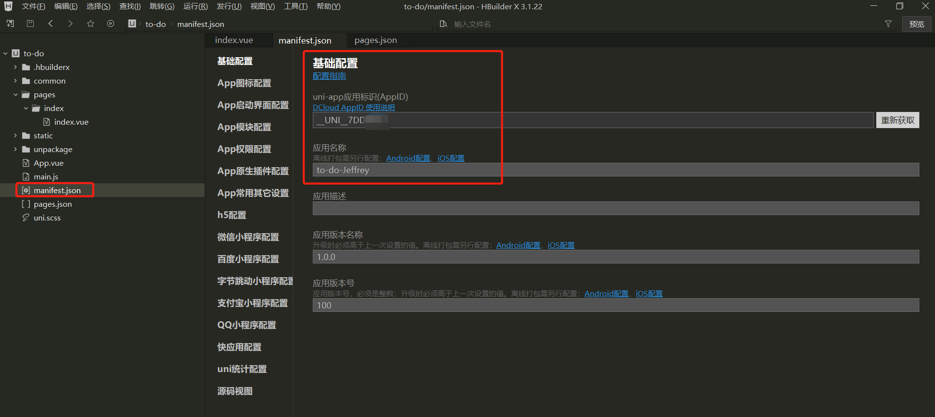 首先在manifest.json文件中进行基础配置,获取uni-app的ID号,填写应用名称,应用描述,版本名称以及版本号。