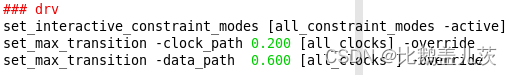 max_transition设置,做设计一般不用库里的,因为太大了,要覆盖lib里的最大,重新设置一个严格的transition。clock path, 一般定义 5%-8%,data path 一般定义 15%-20%,不同厂商不同工艺可能不同。需要注意的是设置这个属性,要先把set_interactive_constrants_mode打开,这是规定。