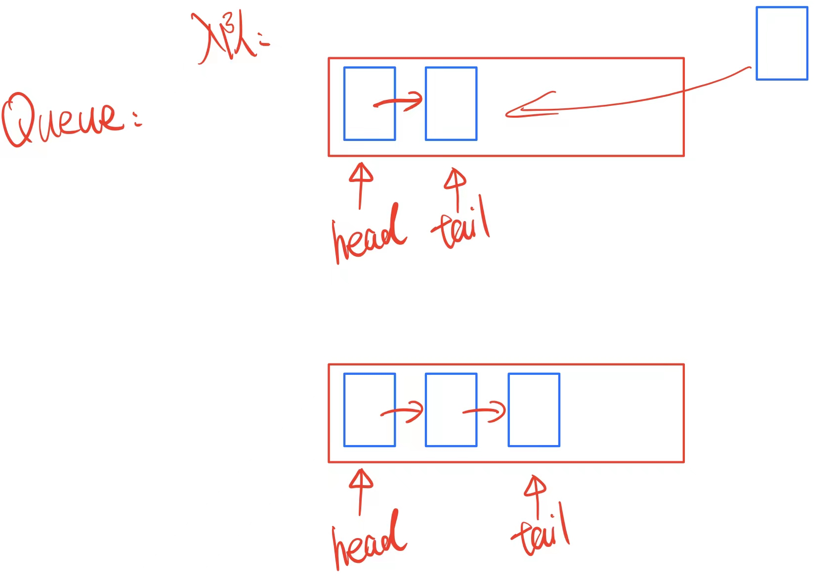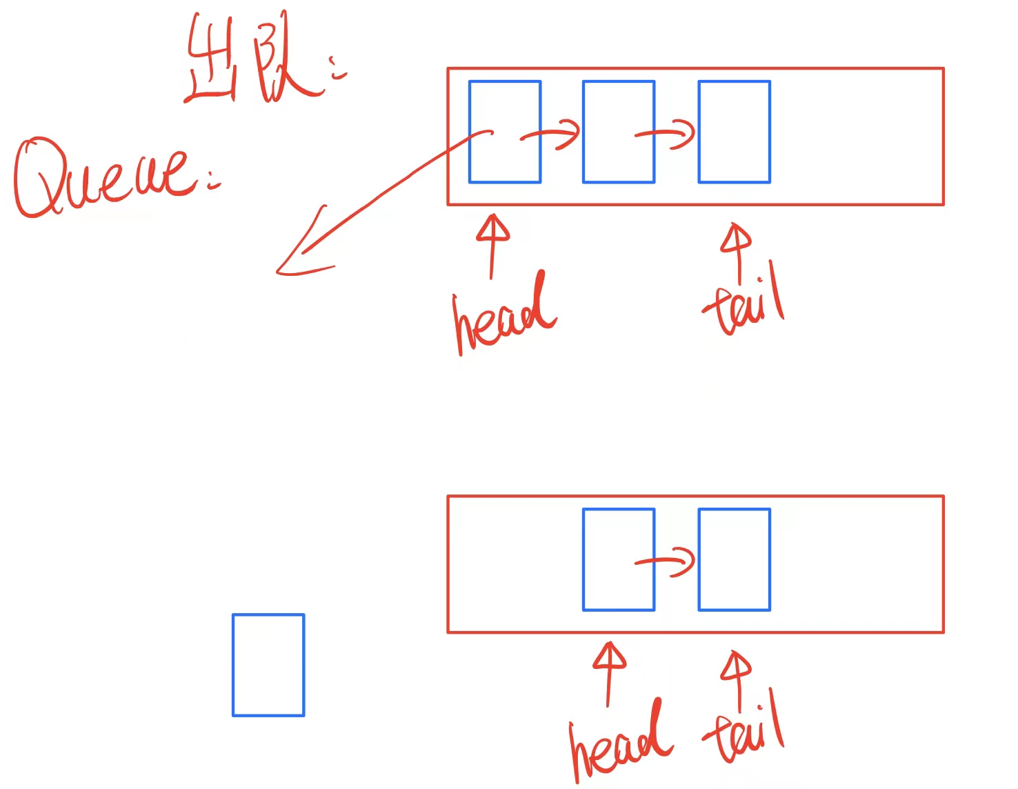 可见,我们只需要增加一个指向队尾的指针就可以快速进行入队的操作。出队时,也只需要将head指针指向下一个即可,反观数组的头删操作比较复杂。