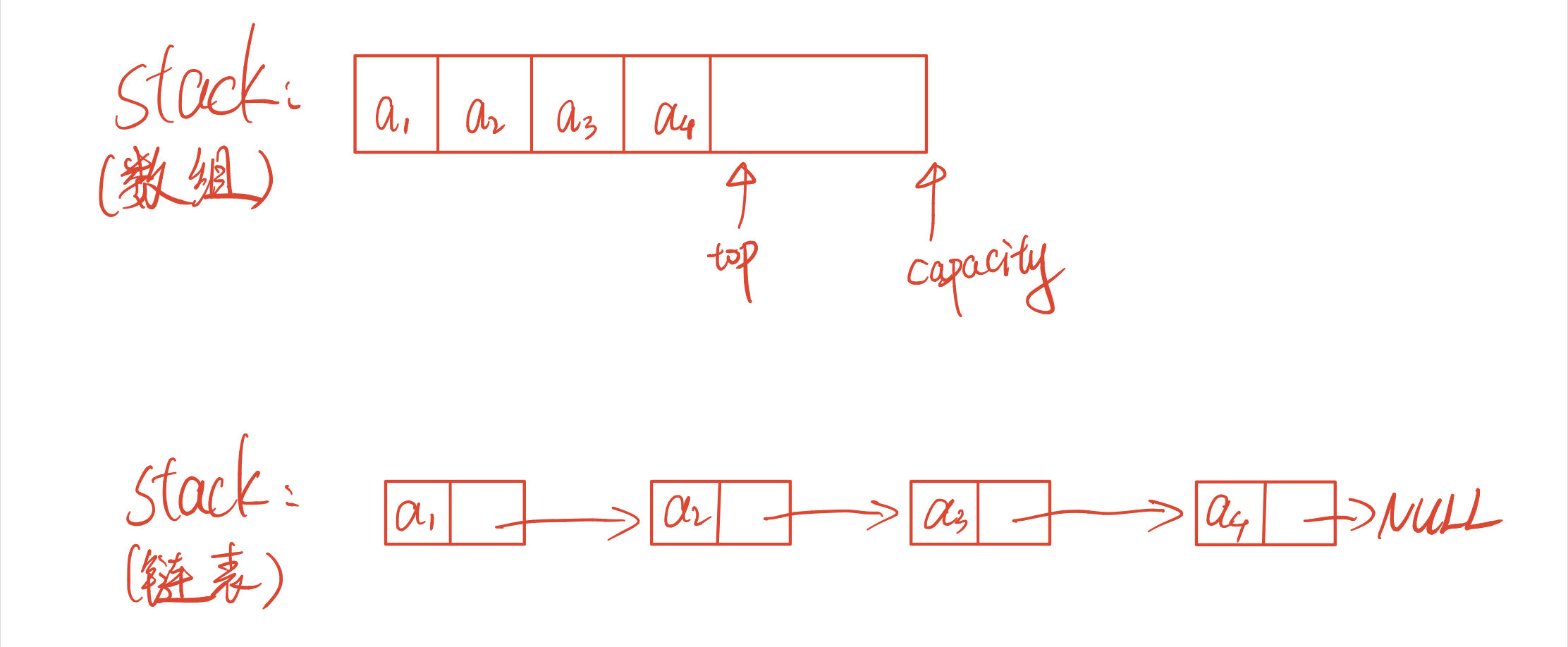 使用链表的方式实现时,若进行出栈操作,每次都需要遍历链表一次找尾进行内存释放实现出栈的操作;相反,使用数组的方式实现时,只需要关注数组的容量是否存满,实现出栈操作时只需要将top(存放在数组内的数据量)自减1即可。出栈操作在两种实现方式的时间复杂度上,数组为O(1),链表为O(N)。可见,使用数组实现栈更优。