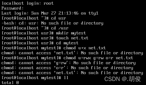 1.在/usr目录中新建一个目录名称为:mytest。并在mytest目录中新建文件net.txt。设置文件的属性为文件属主(u)增加执行权限,文件属主同组用户(g)增加写入权限,其他用户(o)删除读权限。