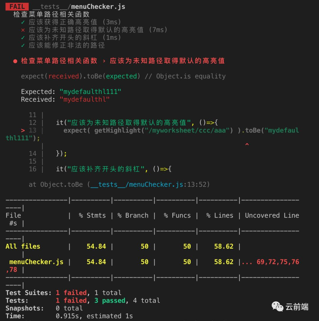运行结果可以说非常友好了,虽然醒目的提示了 FAIL,但是哪条判断错了、错在哪一行、实际的返回值与预期的区别,甚至代码覆盖率的表格,都分别展示了出来;尤其是最重要的对错结果,分别用绿色红色加以展示。
