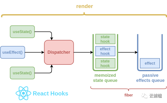 dispatcher 是一个包含了 hooks 函数的共享对象。它将基于 ReactDOM 的渲染阶段被动态地分配或清理,并且它将确保用户不会超出一个 React 组件去访问 hooks (https://github.com/facebook/react/tree/5f06576f51ece88d846d01abd2ddd575827c6127/packages/react-reconciler/src/ReactFiberDispatcher.js#L24)。