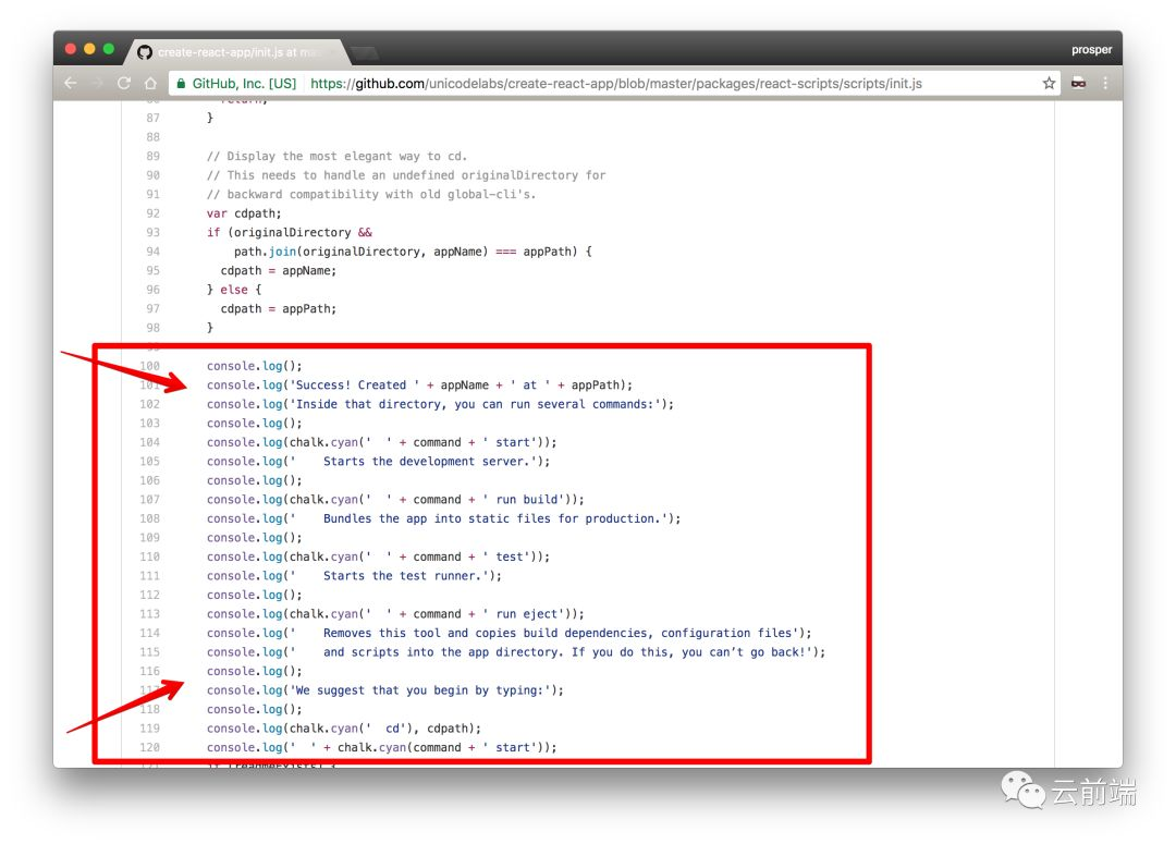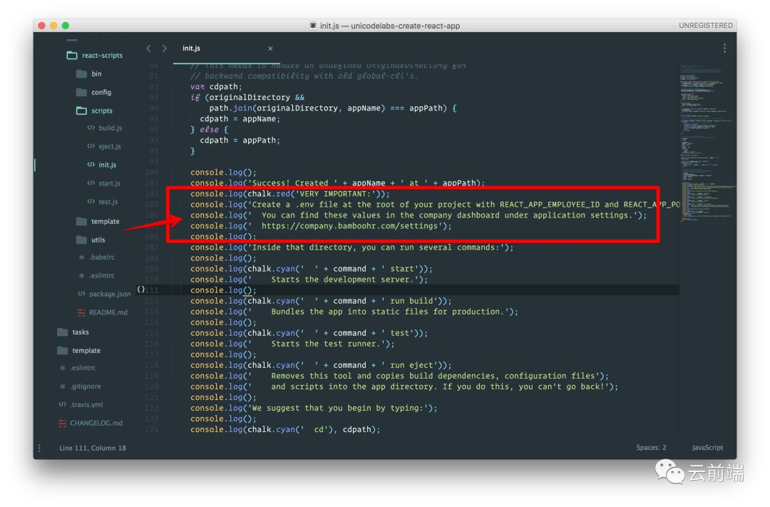 clone 目录后在代码编辑器中打开 react-scripts/scripts/init.js 文件。让我们增加一些 console 信息: