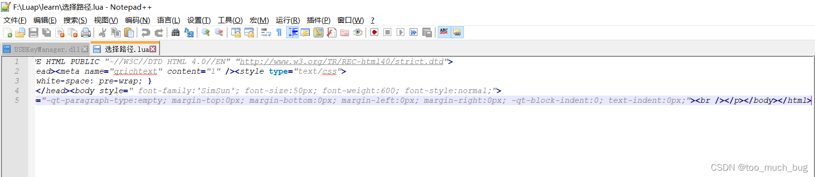 在完成这个功能时查了很多资料,发现实现 代码高亮有很多方法。其中我尝试过使用和设置TextEdit自带的textFormat中的Richtext,发现它会将输入的字符串自动加标签(类似于Html),从而修改显示文字的字体,颜色和大小等属性。但是由于我实现了本地读取,在组件加载后我实现了即时保存功能,这就导致我在创建调试程序后,TextEdit在读取xxx.lua时会污染本地文件,同时无法显示文本内容。截图如下: