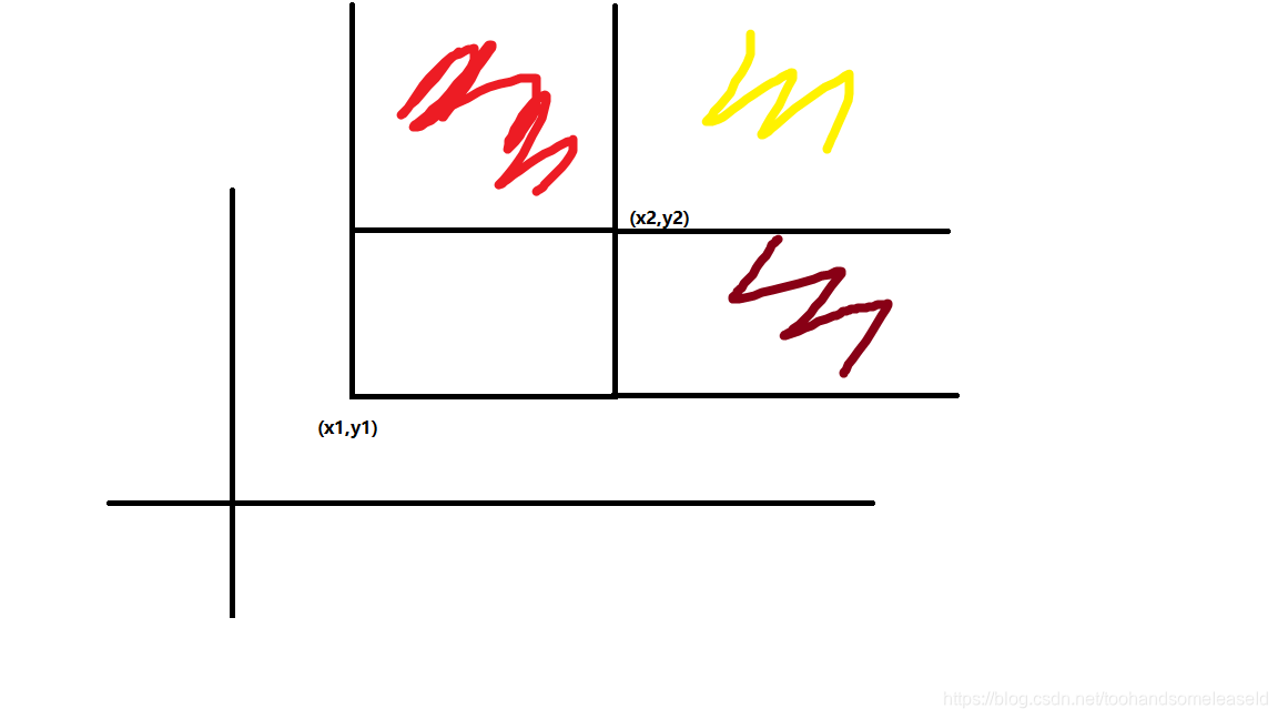 题目思路:二维前缀和模板题,对于添加一个矩阵(x1,y1,x2,y2),需要a[x1][y1]+1(黄),a[x2+1][y]-1(红+黄),a[x1][y2+1]-1(深红+黄),由于右上角被删了两次,所以需要再a[x2+1][y2+1]+1。