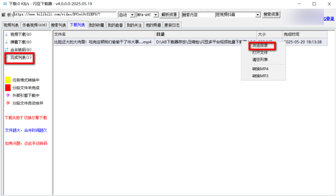 下载完成后,右键文件选"浏览目录",能直接定位到存储位置。我特意看了下视频属性,1080P分辨率,25分钟的视频大小370MB左右,画质和原片没差。遇到下载失败的情况,点"切换引擎下载"就能解决,亲测有效!