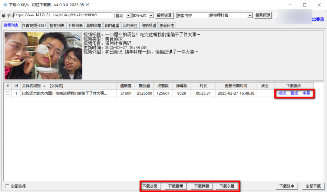 核心功能简直是B站党福音:登录后扫码绑定账号,复制视频链接扔进去,2160P高清视频、弹幕、封面甚至音频都能一键打包下载。实测下载速度稳在10.44MB/s,25分钟的美食视频,泡杯茶的功夫就下完了。