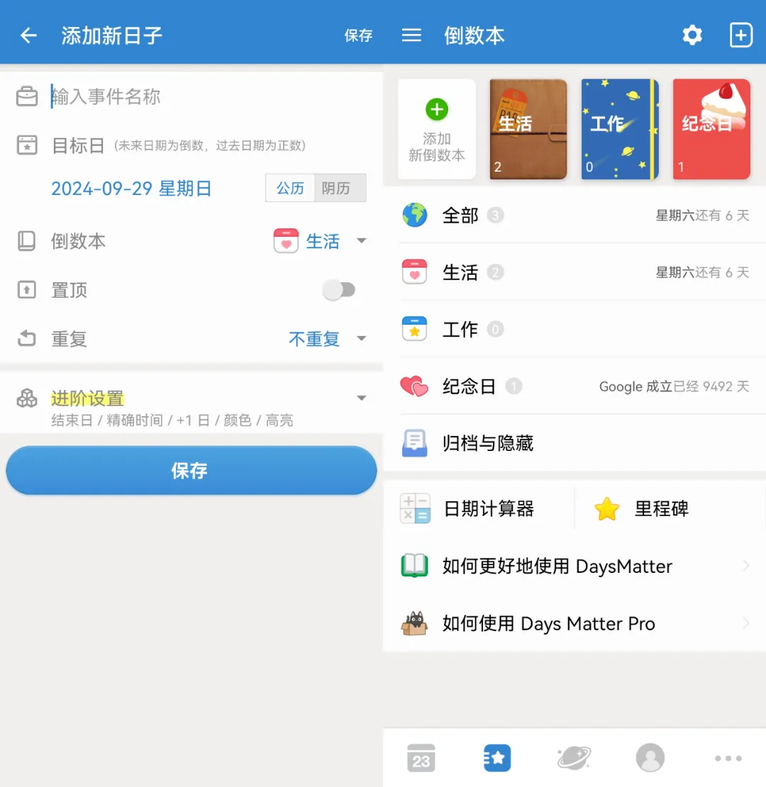 点右上角的“+”号就能添加新日子,能写事件名称、选目标日,还能分到不同的倒数本里,也可以置顶。高级功能里,像密码保护、隐藏功能、精确计时模式,还有自定义倒数本封面和背景、150枚高级会员图标、高级图片分享样式、添加无限个小倒数日、10种超美倒数字体、重要日子高亮(有8种颜色可选)这些,现在都能免费用。