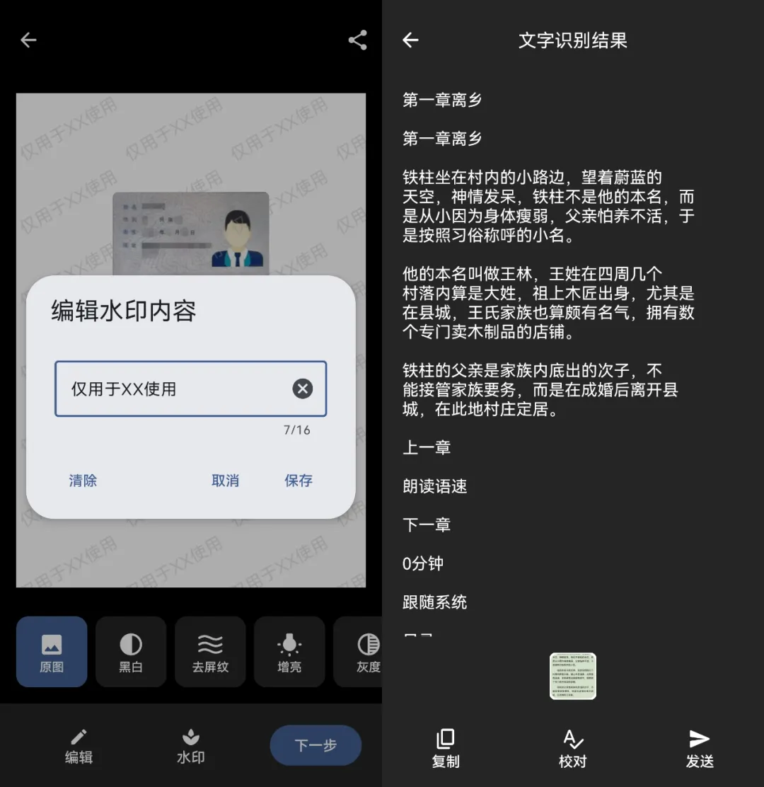 就说证件扫描吧,里面有好几种滤镜可以选,还能给扫描件加水印,导出的时候能选Word或者PDF格式,特别实用。文字识别的准确度也挺高,识别出来的内容能一键复制,还支持校对,不怕出岔子。