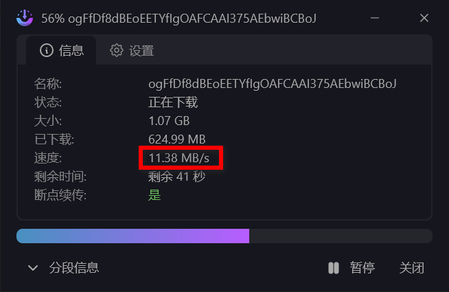 下载速度快:支持多线程下载,速度最高能提升500%,实测可达11.38MB/s,而且非常稳定,波动很小。