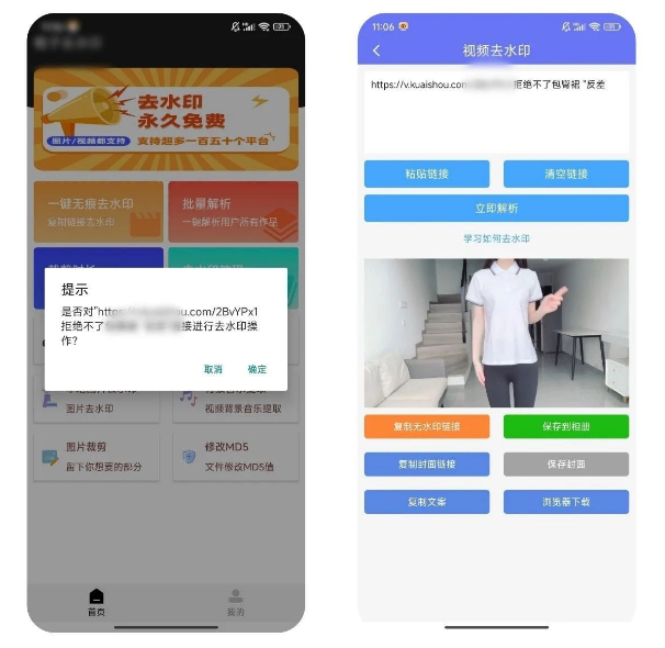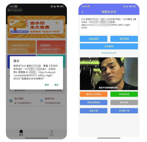 操作简单到我妈都能学会。复制视频链接,打开APP会自动识别,点一下“立即解析”,几秒钟就出无水印版本,直接保存到相册,连粘贴这一步都省了。上次帮表妹下她爱豆的舞台视频,解析完连角落的小水印都没了,清晰度跟原视频一模一样,她直夸比花钱充会员的工具还好用。