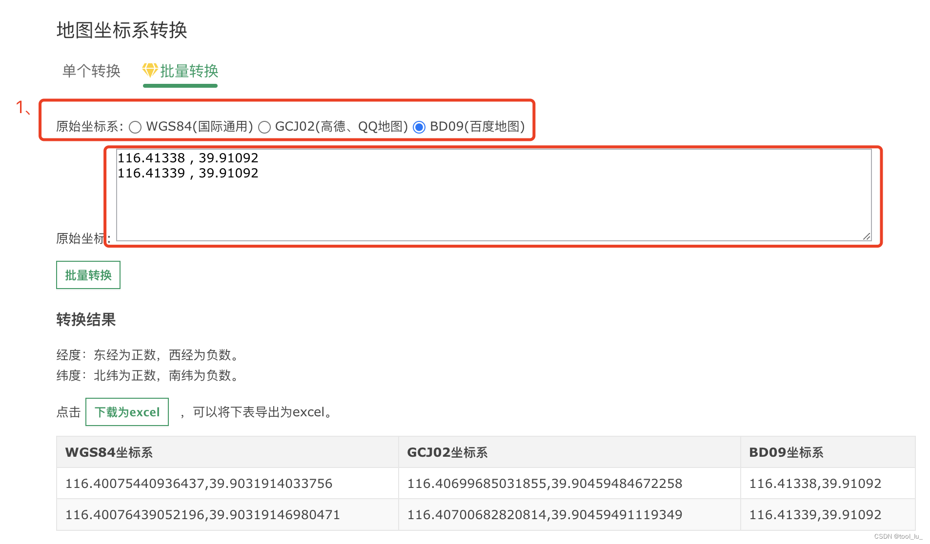 本文介绍了如何使用一个在线工具快速进行地图坐标系的批量转换,包括WGS84、GCJ02和BD09之间的互转。该工具支持Excel导入导出,方便快捷,旨在帮助GIS开发者提高工作效率。