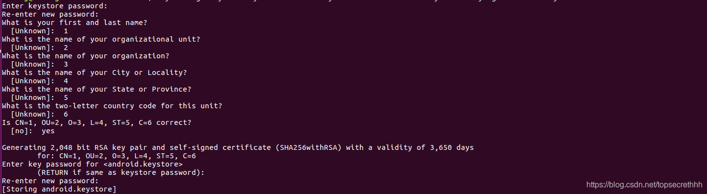 首先输入keytool -genkey -v -keystore android.keystore(xxx即为keystore名称) -alias xxx (xxx为别名) -keyalg RSA -validity 3650,接着照着提示输入信息: