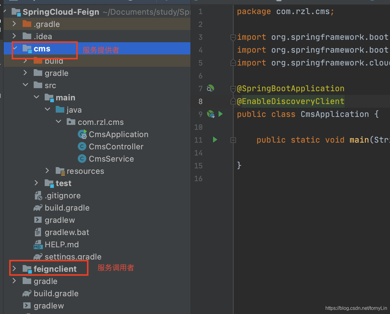 为了演示方便,博主写了一个简单的demo。其中,cms是服务提供者。demo代码结构如下: