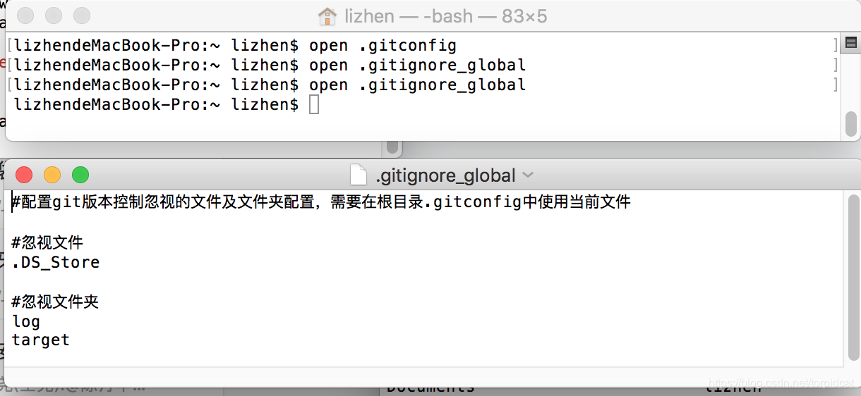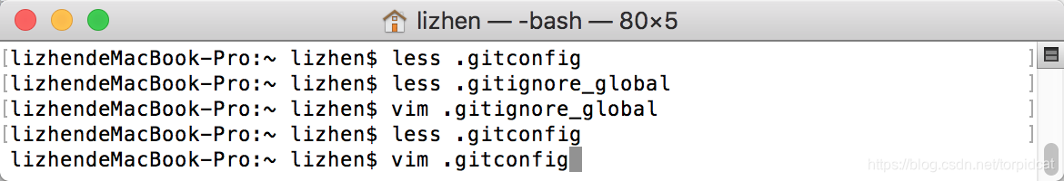 进入当前用户目录下查看是否有.gitconfig(git配置文件) 和 .gitignore_global(git全局忽视配置文件);或者打开终端,open命令编辑器查看编辑并保存;再或者less 命令查看,vim 命令修改。