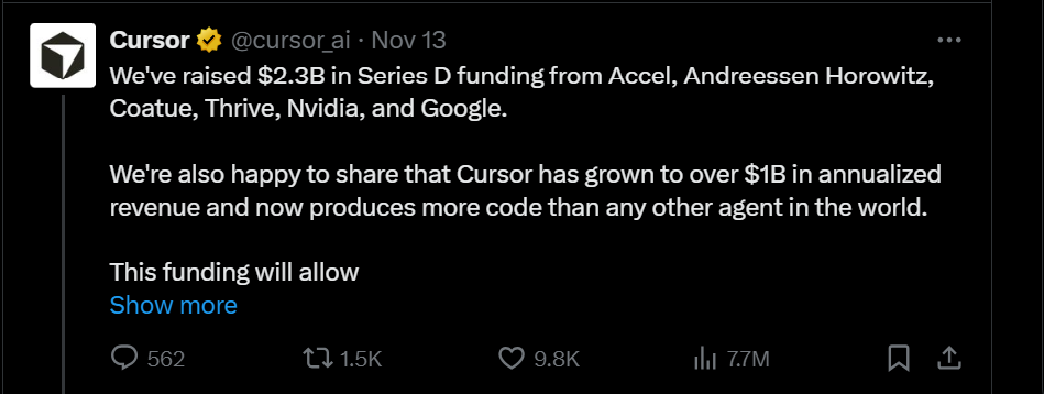 事件四:Cursor AI编程工具融资23亿刀,估值飙至293亿