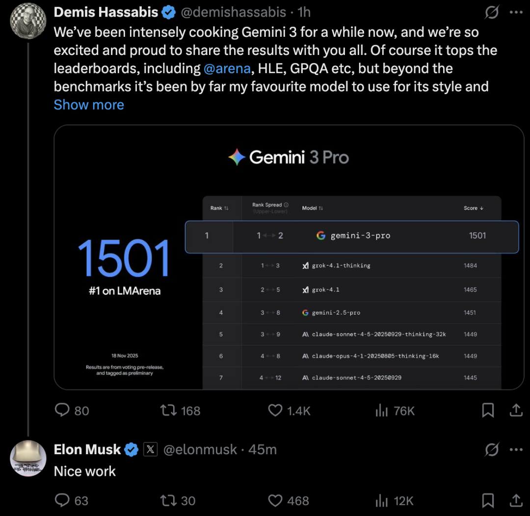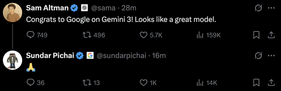 OpenAI联合创始人、CEO萨姆·阿尔特曼(SamAltman)和xAI创始人、CEO埃隆·马斯克(ElonMusk)纷纷向谷歌发来“贺信”。阿尔特曼发推评价“Gemini3看起来很不错”,谷歌CEO桑达尔·皮查伊(SundarPichai)用了个表情包回复。
