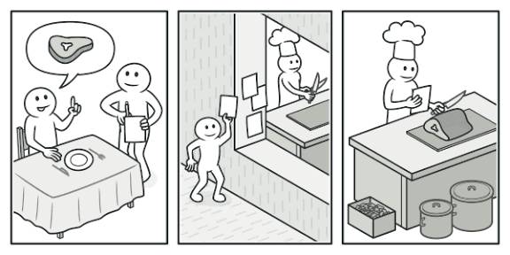 - 顾客不用知道后厨怎么做菜、用什么食材,只需等待上菜;后厨不用知道谁点的单,只需按菜单做菜。