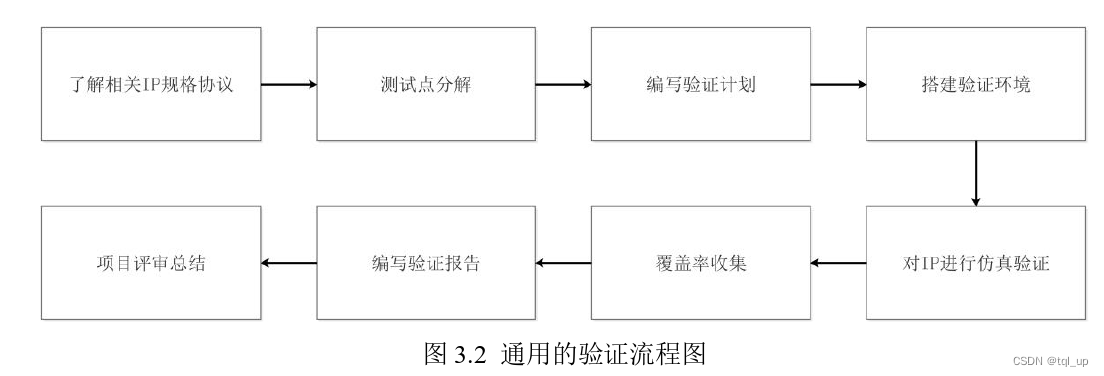 随着工艺的不断提升,SoC将集成更多的模块,集成度的提高使得验证工作的质量和效率成为影响当下SoC芯片开发流周期的关键因素。对于功能日益复杂的SoC芯片,为了提高验证工作的高效性、完备性和正确性,验证人员除了使用高效的EDA工具来帮助提高验证效率,制定明确合理的验证计划,使用科学的验证方法学也是十分必要的。准确性。下图3.2为具体的验证流程。
