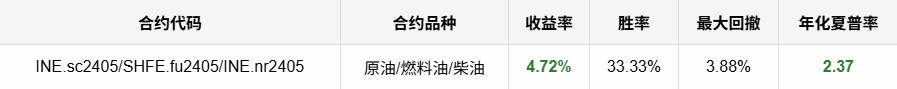 - 交易品种: INE.sc2405/SHFE.fu2405/INE.nr2405
