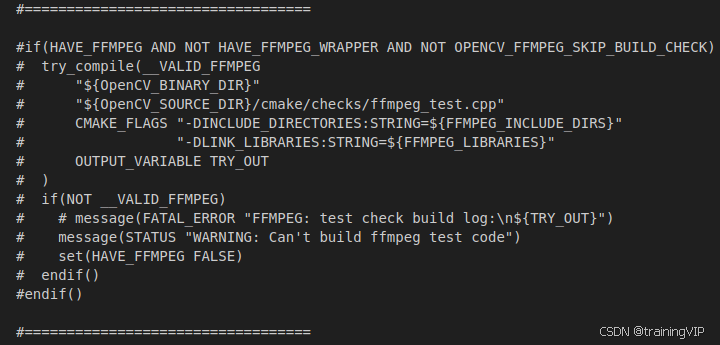 解决ffmpeg为NO问题,需要修改文件:opencv-4.5.3/modules/videoio/cmake/detect_ffmpeg.cmake。将以下内容注释掉,重新sh test.sh即可