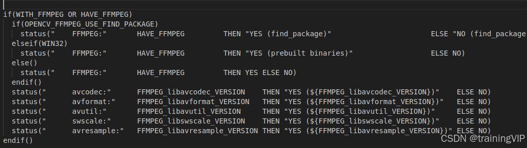 原因:ffmpeg是否为yes的判断条件除了WITH_FFMPEG=ON外还有HAVE_FFMPEG