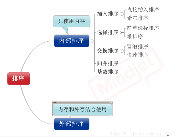 排序大的分类可以分为两种:内排序和外排序。在排序过程中,全部记录存放在内存,则称为内排序,如果排序过程中需要使用外存,则称为外排序。下面讲的排序都是属于内排序。