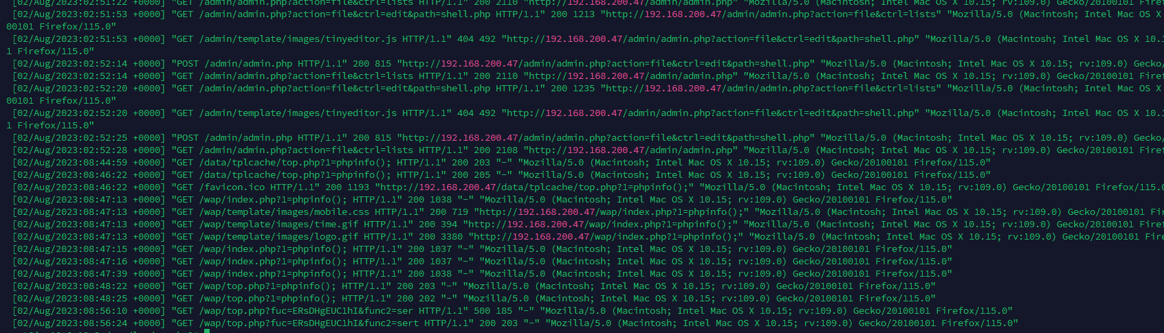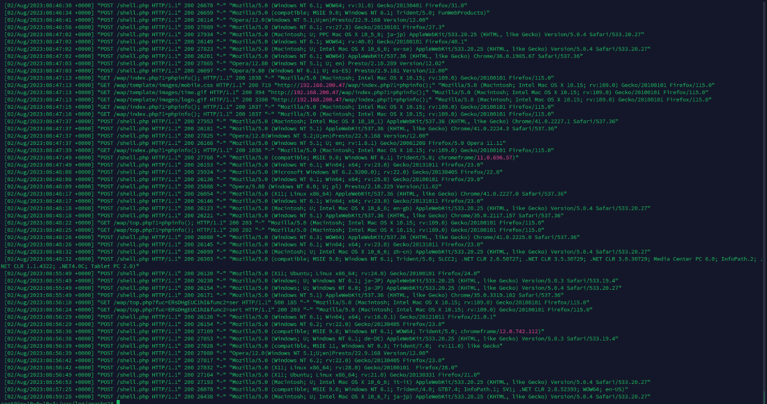 同时根据上面 awk 筛选出来的日志文件,可以看到 shell.php 的交互的一些 ua 头还是比较少的,就三四个在交换,而文章中说到冰蝎内置十几个 ua 头进行随机,但是哥斯拉 ua 头是可以自己进行定义的,再加上 gz.php 文件中存在使用 php://input进行读入,所以应该是哥斯拉