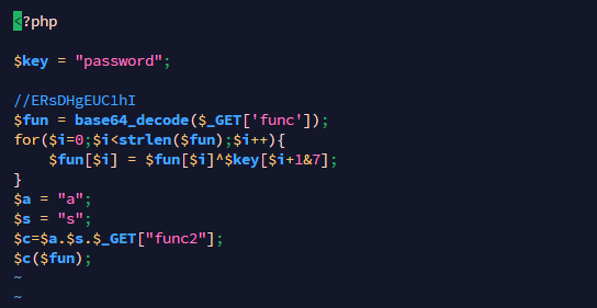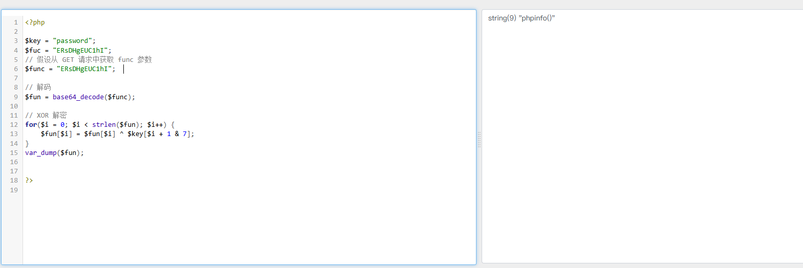 这里接取到两个参数,func 和 as 进行拼接,组成了 assert这个函数来执行一个 fun 变量的代码,不过这里使用了异或到底是什么,所以可以使用 php 运行一下,看看结果