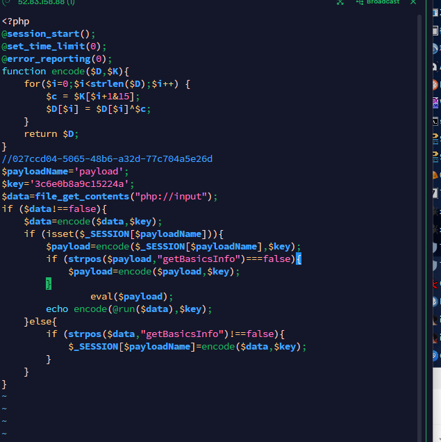 | Godzilla(哥斯拉) | 有 @session_start(), 自定义 encode(), 数据从 php://input 读入,常配合 payload 加密 |