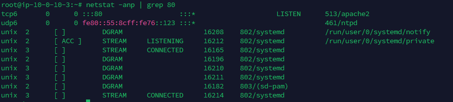 这里选择先使用 netstat 命令来看一下 80 端口的连接以及进程 PID 和程序名