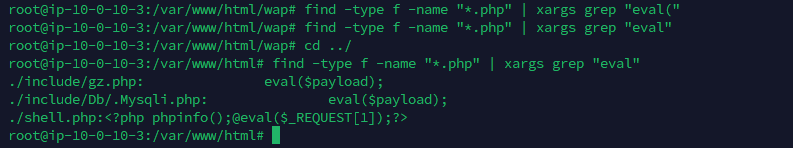 第三个任务要找到隐藏的 shell 的路径,可以想到之前使用 find 命令时,确实存在一个 .开头的隐藏文件,使用 vim 命令查看了这个文件,发现这确实就是一个 webshell,对他的路径进行 md5,我们就拿到了 flag3