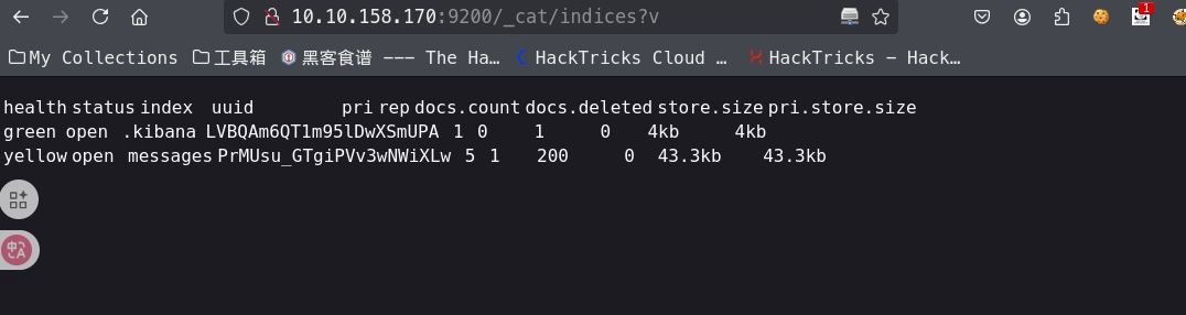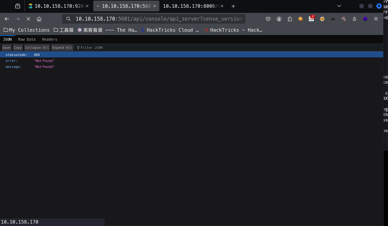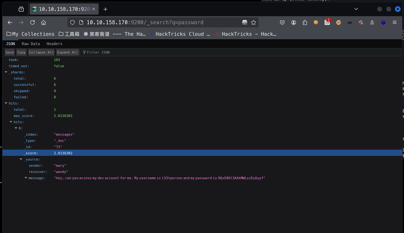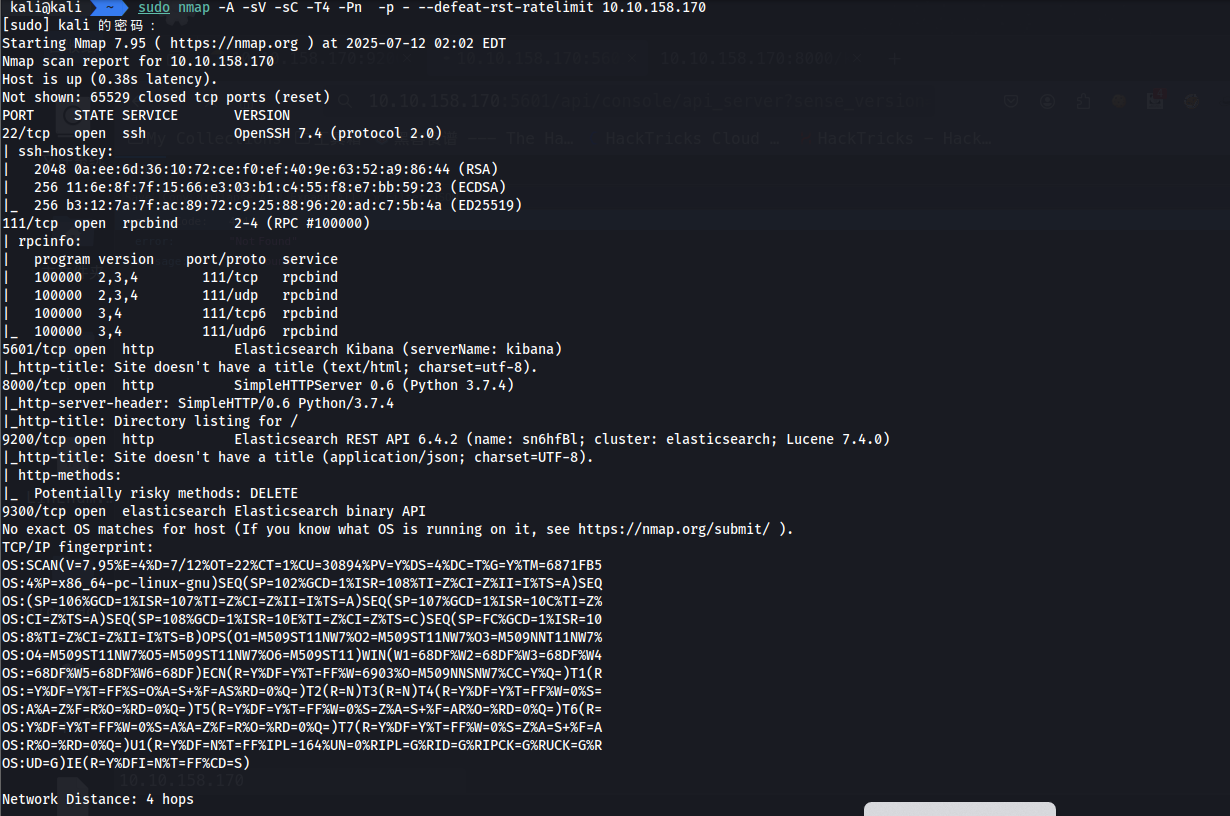 使用 nmap 进行扫描,找到了 5601,8000,9200 端口,其中 8000 端口只有一个日志文件,9200 端口是 Elasticsearch,也就是 ELK 中的数据库,接下来我们要浏览器进行访问这个 api 接口,然后找到其中的密码