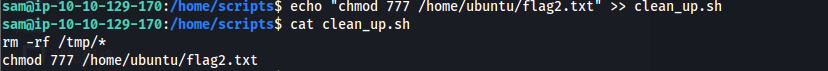 这里尝试传入一个 linpeas.sh 来看看利用点,不过在 crontab 中好像啥都没有,然后 find 一下 flag2,发现是 ubuntu 用户目录中,然后在 home 目录下找到一个 shell 文件,发现是在清理 tmp 文件,之前那个 linpeas 的脚本我就是传入到 tmp 目录,再查看已经没有了,所以这个就有可能是一个定时运行的任务
