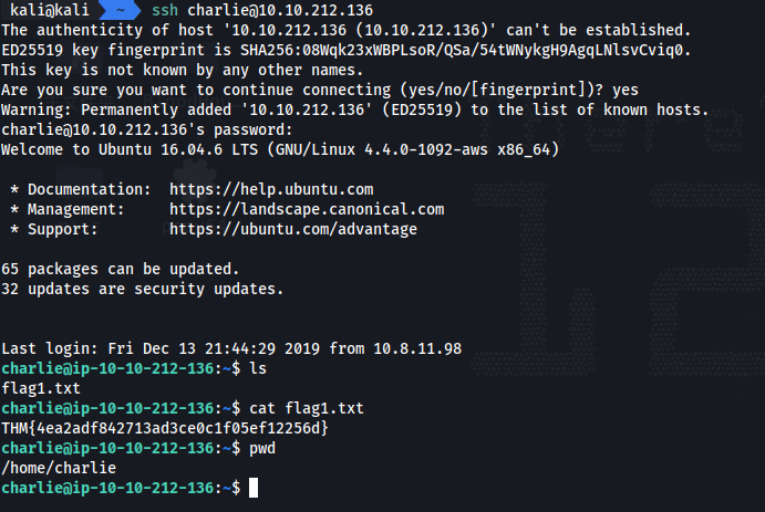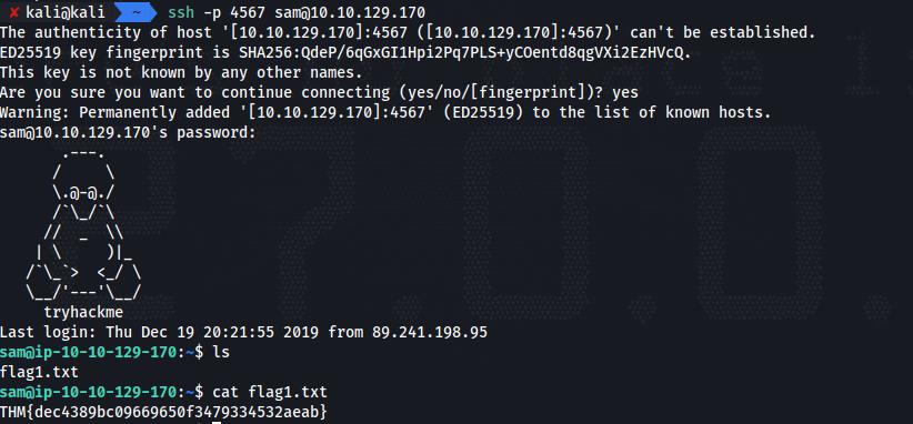 使用 ssh 连接,登录目标机器,就可以在用户目录下找到 flag1.txt 文件