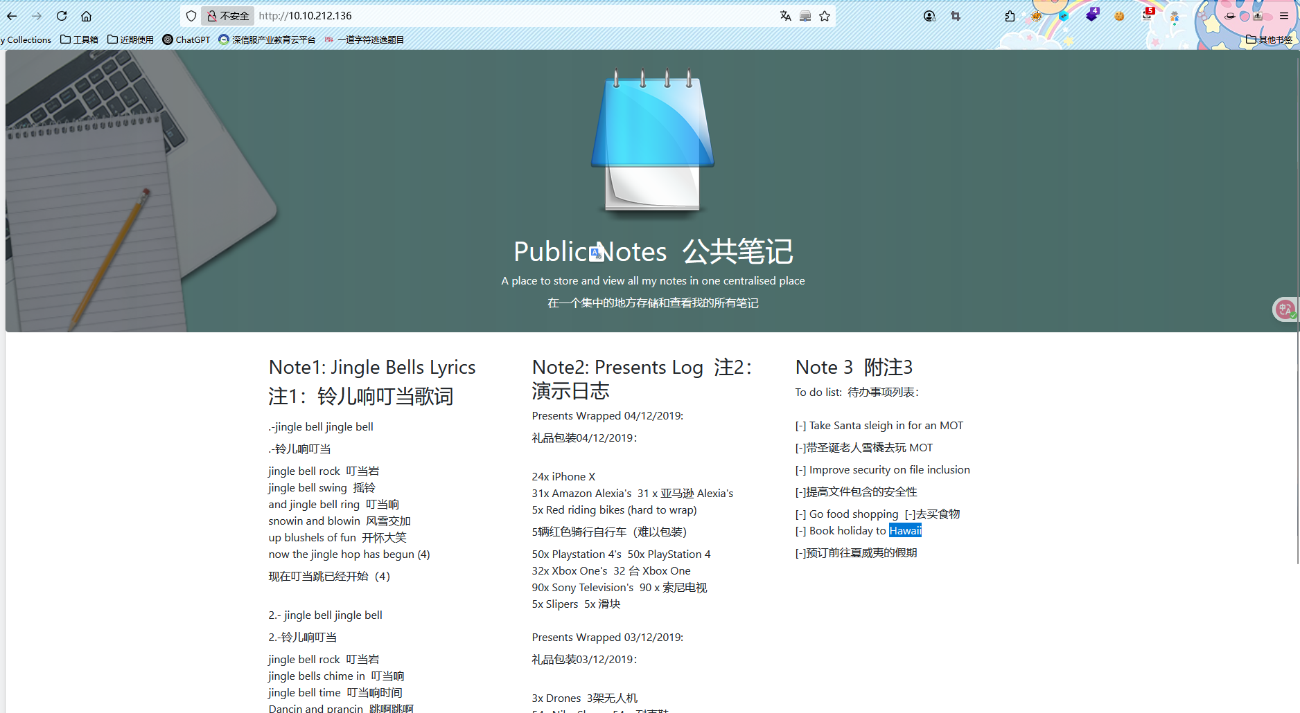 进入网站,看到备忘录,里面写了第一道题目的答案,说明了假期旅游的地方
