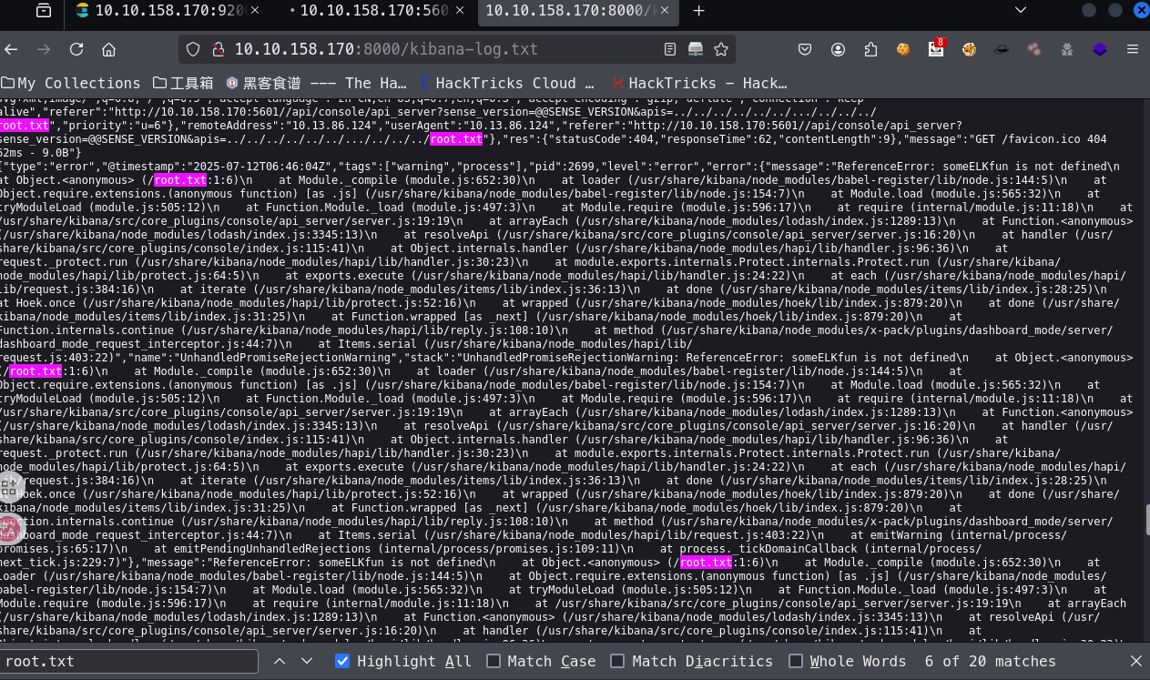 然后下一个 root.txt 文件的内容,提示说是利用 cve 漏洞,这里找到了 kibana 的版本是 6.4.2,然后再谷歌搜索,找到他存在一个本地文件包含漏洞,正好可以去包含我们需要的 txt 文件,然后再到日志中查看到信息