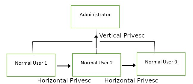 - 垂直提权(权限提升):指尝试利用已攻陷的现有帐户获取更高权限或访问权限。
