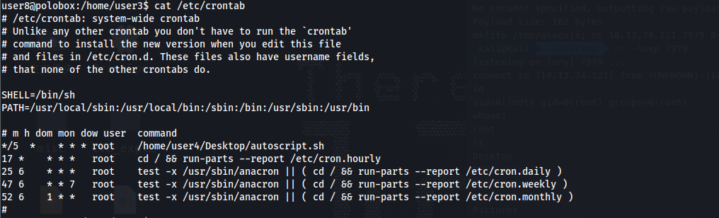 那么如果我们发现一个在 user4 桌面的 cron 任务,是使用 root 用户来运行的,那我们可以修改其中的文件来执行反弹 shell 的命令