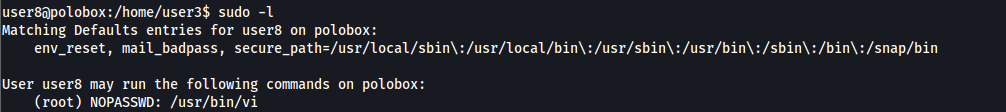 比如这个图片就显示我们可以不用密码来以 root 权限运行 vi,这个利用和之前的 suid 文件利用有些相似