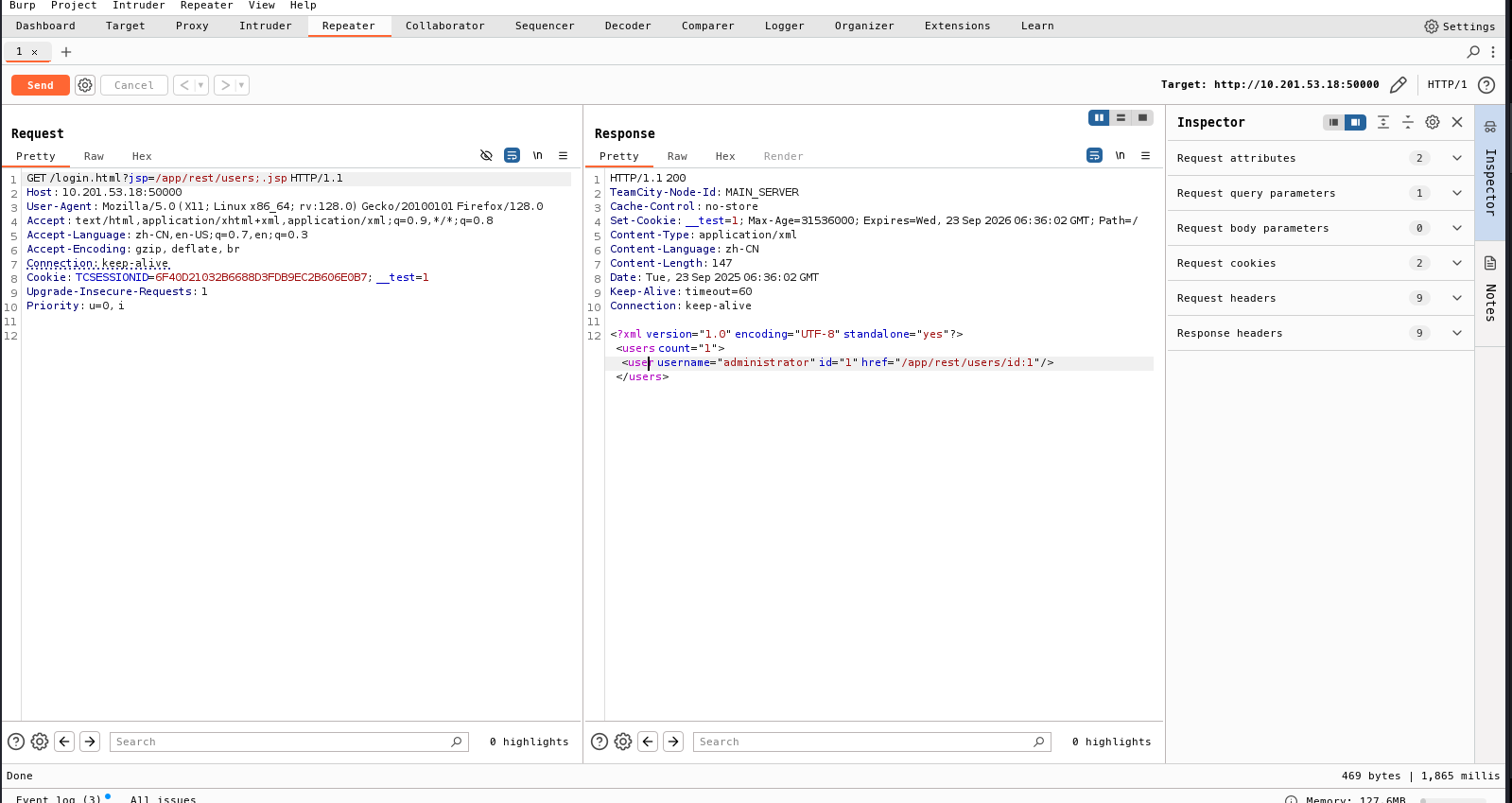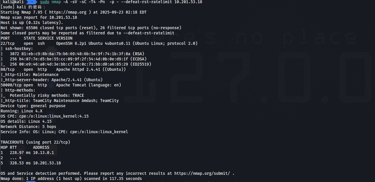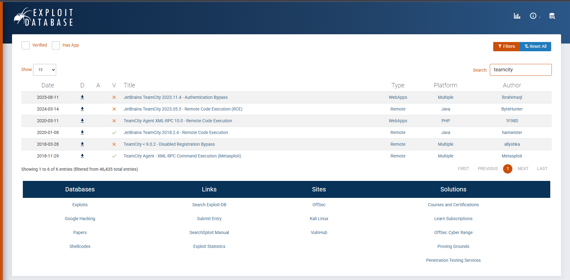 这里看到 80 和 50000 端口上运行了 http 服务,分别使用浏览器访问之后,80 端口上好像没啥东西,不过 50000 端口上运行了一个 teamcity,然后感觉应该是在这里存在漏洞,这里我去漏洞网站搜索了一下,发现第一个漏洞就是版本和靶机的 teamcity 版本差不多