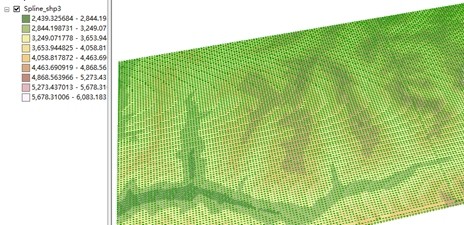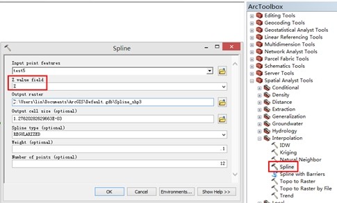 4、 打开【ArcToolBox】并定位到空间分析工具【Spatial Analyse Tools】(ArcGIS支持多种插值算法,后面会详细介绍)这里我们使用样条函数插值Spline算法,双击【Spline】工具打开设置窗口,选择刚刚加载下载的高程图层,然后配置高程字段,请选择字段Z,点【OK】: