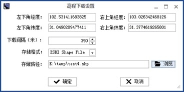 2、 双击矩形框进行下载设置,您可以配置更精准的坐标范围、下载间隔(系统会动态计算合适的间隔,您也可以手工设置)、存储格式信息,这里以【ESRI Shape File】作为存储格式,点【确认】开始下载: